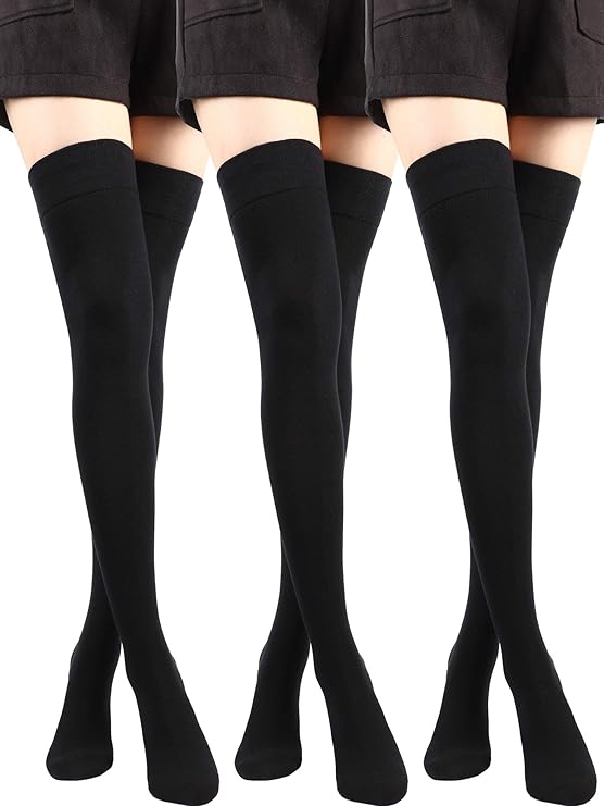 3 Pairs Thigh High Socks Cotton Over Knee Socks Knit Long Boot Stocking, Black, Medium