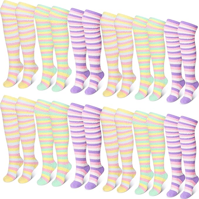 12 Pairs Women Thigh High Fuzzy Socks over Knee Sockings Cute Warm Long Fluffy Socks Fluffy Cozy Striped Socks(Warm Color)