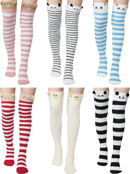 6 Pairs Women's Thigh High Fuzzy Socks Cute Cartoon Over the Knee Stockings Stripe Leg Warmers for Girl Women