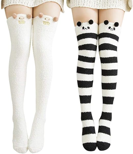 Womens Over Knee High Fuzzy Socks Cute Cartoon Thigh High Stockings Warm Stripe Leg Warmers